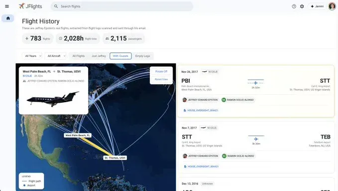 You can filter by aircraft (N212JE, N908JE — the infamous tail numbers), by year, or toggle between "Just Jeffrey" and flights with guests. Maps show the routes arcing across the Caribbean. Each entry links back to source documents.