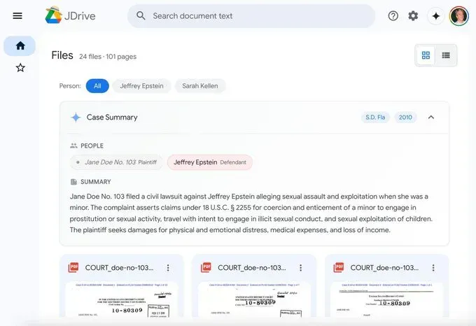 JDrive provides full-text search across the entire document corpus — 24 files totaling 101 pages in the initial release, with more being added continuously. Filter by person ("Jeffrey Epstein," "Sarah Kellen"). Click into case summaries that provide structured metadata: case number, jurisdiction, year, parties involved, and plain-English descriptions of what each document contains.