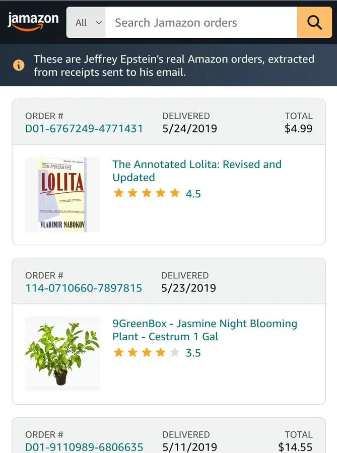 JAmazon recreates Epstein's Amazon order history, extracted from receipt emails. The interface looks exactly like checking your own purchase history — product images, order numbers, delivery dates, star ratings.