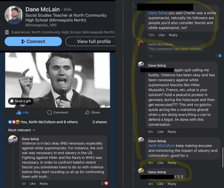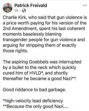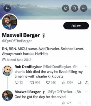 The posts ranged from dark humor to explicit celebration. Some wrote "karma's a bitch" while others posted "Good riddance to bad garbage." One assistant dean at MTSU wrote: "Looks like ol'Charlie spoke his fate into existence. Hate begets hate. ZERO sympathy." A high school teacher in Iowa allegedly posted "1 Nazi down" on Facebook.