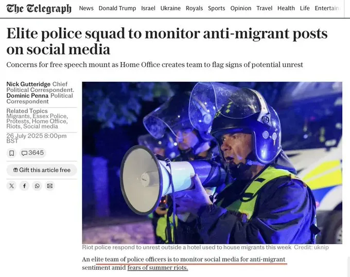 The UK Home Office has formed an elite team of police officers to monitor social media for "anti-migrant sentiment" as part of a new investigative unit designed to "identify early signs of potential civil unrest." This National Internet Intelligence Investigations team will operate from the National Police Coordination Centre (NPoCC) in Westminster, drawing officers from forces across England and Wales.