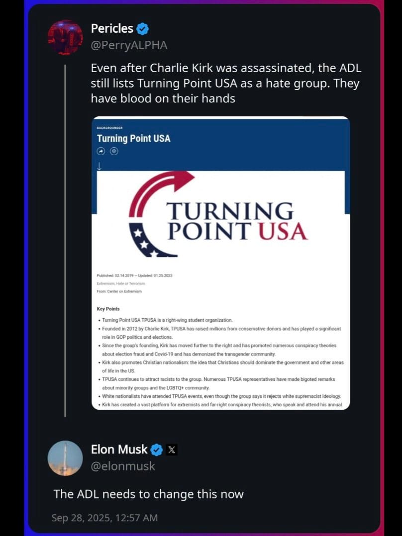 The ADL's database described Turning Point USA as having ties to right-wing extremists and listed numerous controversial statements by TPUSA members dating back to 2015. Elon Musk and other prominent conservatives accused the ADL of contributing to a climate that led to Kirk's assassination, with Musk claiming "the FBI was taking their 'hate group' definitions from ADL, which is why FBI was investigating Charlie Kirk & Turning Point, instead of his murderers".