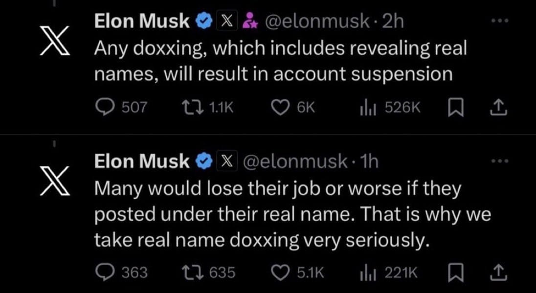 - Doxing concerns: Musk's stated policy that "any doxing, which includes revealing real names, will result in account suspension" reflects genuine privacy concerns when advocacy groups publicly identify individuals