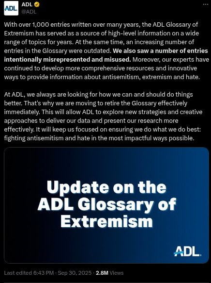 The announcement follows weeks of intense backlash after Charlie Kirk was assassinated on September 10, 2025, while speaking at Utah Valley University. In the aftermath of his killing, attention turned to how the ADL had categorized Kirk's organization in its "Glossary of Extremism and Hate."
