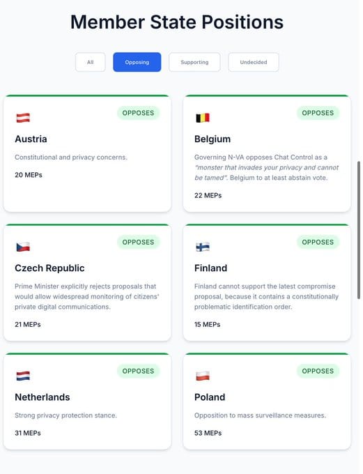 Many countries within the EU Council that helped block Chat Control in 2024 are now wavering. The following countries are undecided or unclear: Belgium, Czech Republic, Estonia, Finland, Germany, Greece, Slovenia, Luxembourg, Romania, while several formerly opposed governments such as France have already given up their opposition.