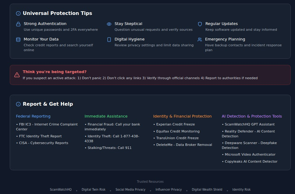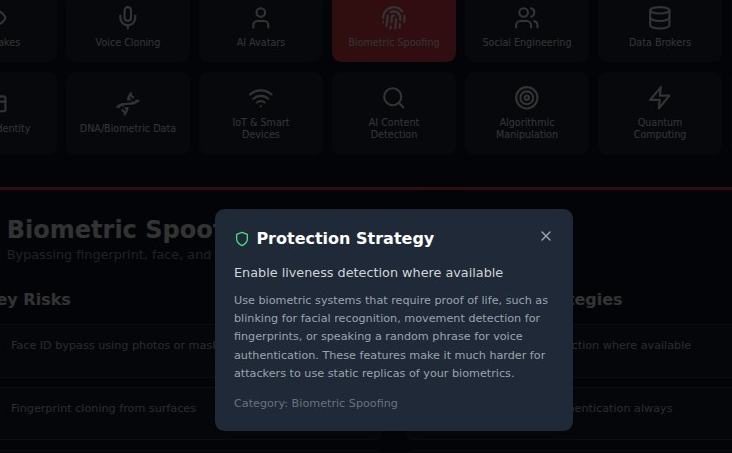 Our AI Security Defense Hub represents a paradigm shift in cybersecurity education. Rather than generic warnings, we provide specific, actionable guidance across 14 critical categories of AI-powered threats that every person should understand: