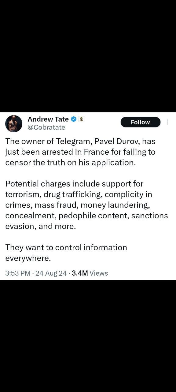 - Andrew Tate: Andrew Tate shared that Pavel Durov was arrested in France for failing to censor content on Telegram, with potential charges including support for terrorism and other serious crimes. Tate suggested that the arrest was part of broader efforts to control information globally.