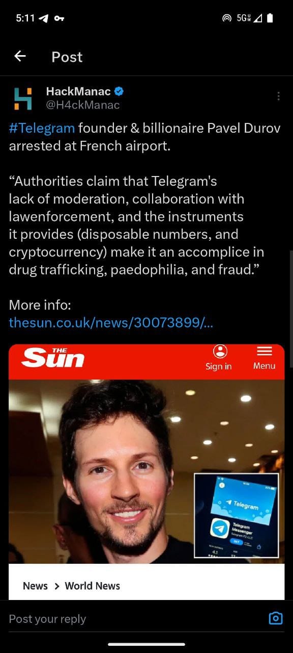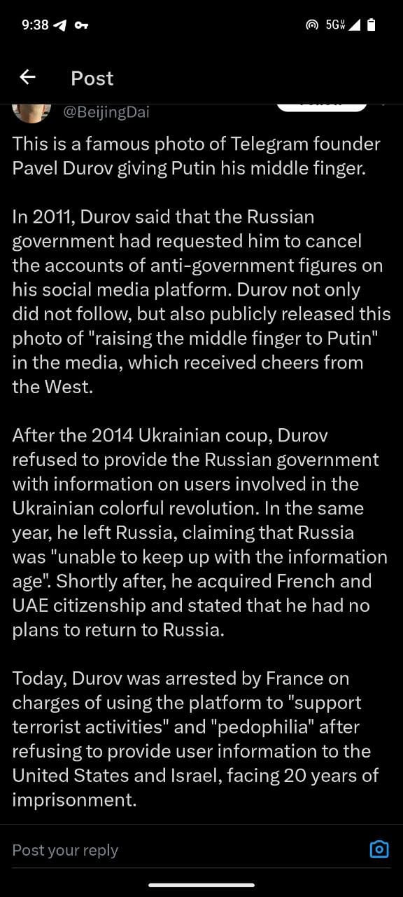 [1] https://www.aljazeera.com/news/2024/8/26/who-is-telegram-founder-pavel-durov-all-to-know-about-his-arrest-in-france