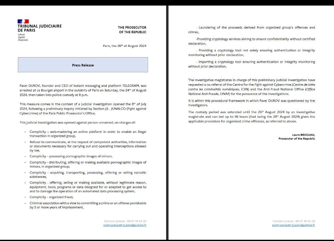 Tribunal Judiciaire de Paris regarding the arrest of Pavel Durov, the founder and CEO of the instant messaging platform Telegram. The document, dated August 26th, 2024, details the circumstances and charges leading to his arrest.