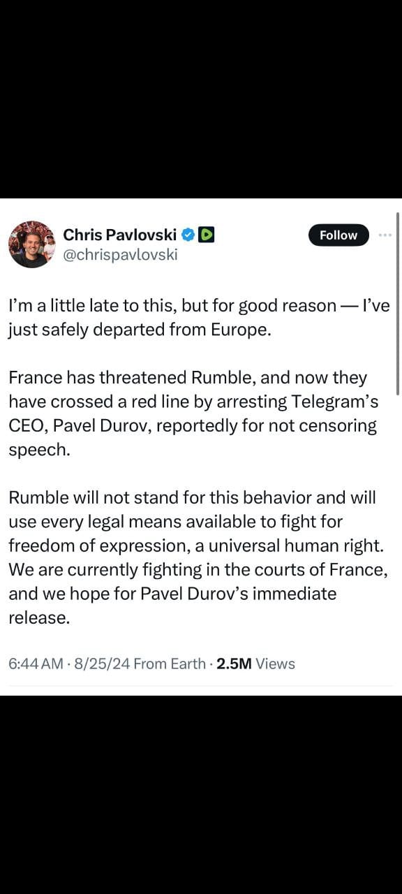 - Chris Pavlovski: The CEO of Rumble, Chris Pavlovski, announced that he had safely departed Europe, reacting to the news that Telegram's CEO, Pavel Durov, was reportedly arrested in France for refusing to censor speech. Pavlovski condemned France's actions and vowed that Rumble would use all legal means to fight for freedom of expression.