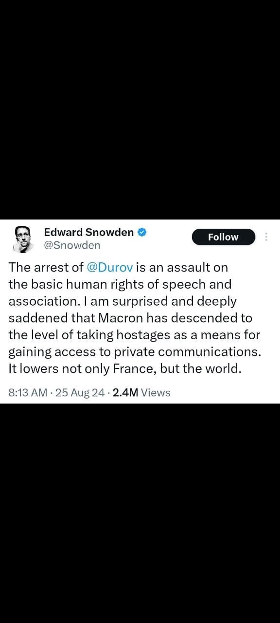 - Edward Snowden: Edward Snowden expressed his dismay over Durov's arrest, calling it an assault on basic human rights like speech and association. He criticized France's actions, implying they were tantamount to taking hostages to gain access to private communications.
