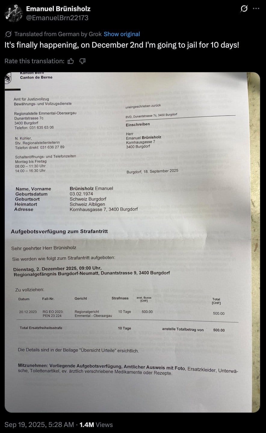 Public Attention Serves a Purpose: By announcing his imprisonment publicly and sharing the summons, Brünisholz ensures his case receives attention. His prosecution becomes a cautionary tale about where hate speech laws lead when divorced from common sense limitations.