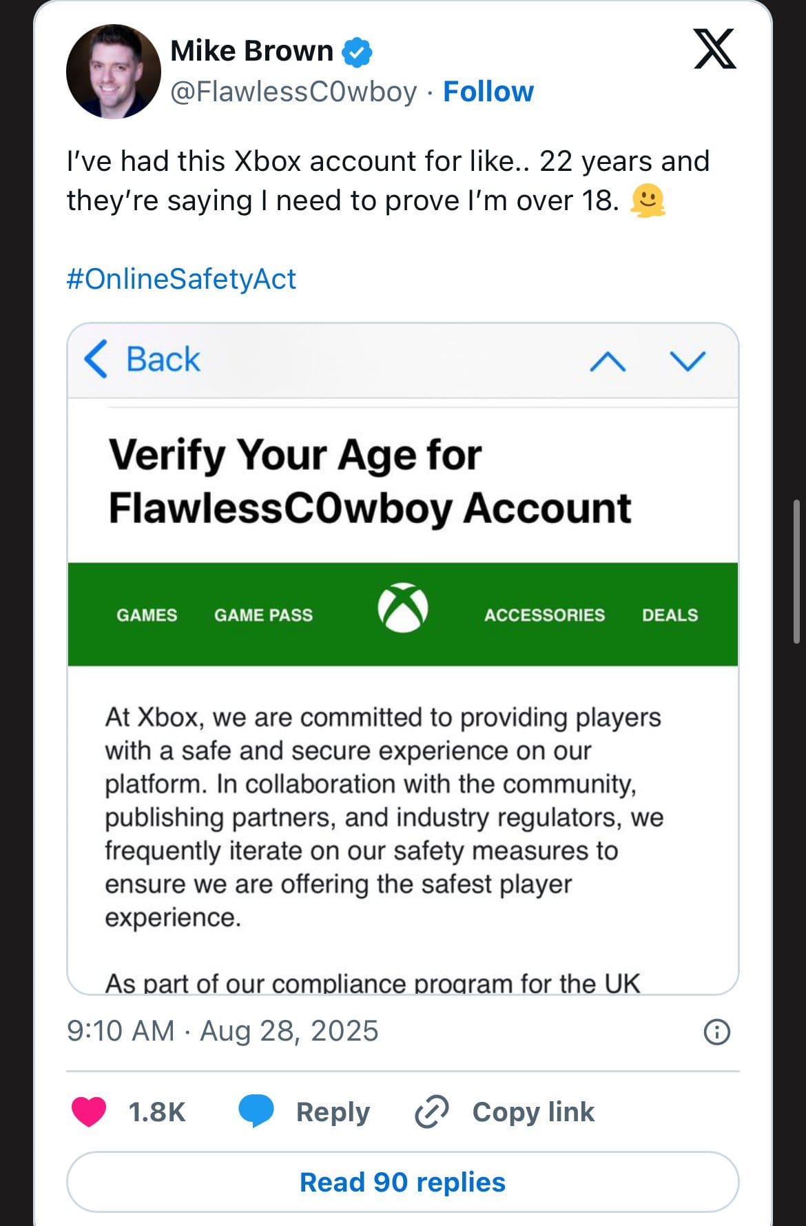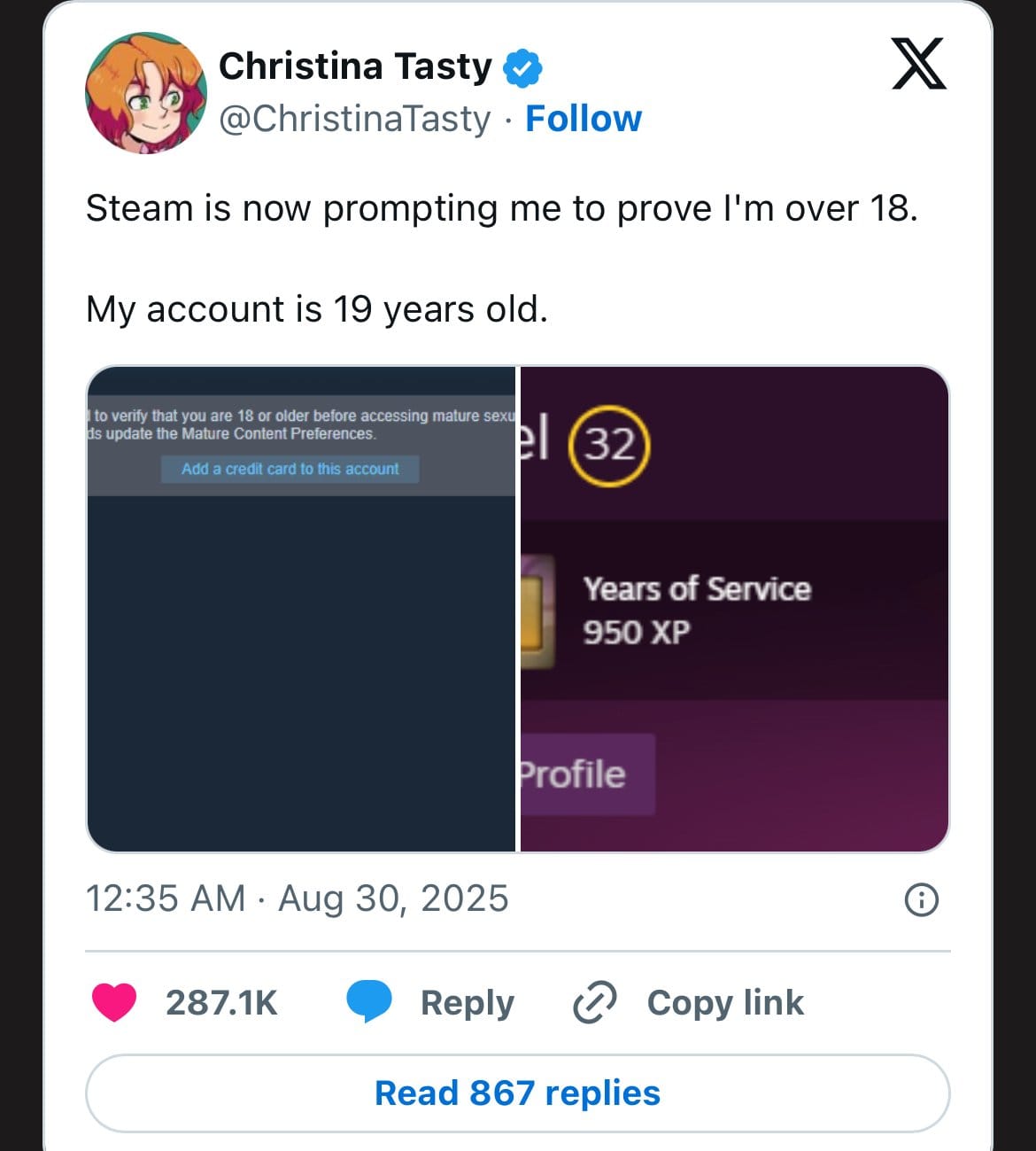The tweets shown in the images—Christina Tasty's 19-year-old Steam account requiring age verification and Mike Brown's 22-year Xbox account facing the same requirement—represent just the tip of the iceberg. We're witnessing the end of the honor system for age verification online.