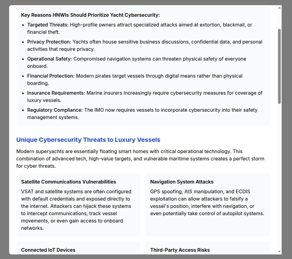 Why It Matters: High-net-worth individuals are increasingly targeted by sophisticated threat actors. Luxury assets like yachts contain connected systems vulnerable to cyber attacks, while wealth visibility creates personal security risks.