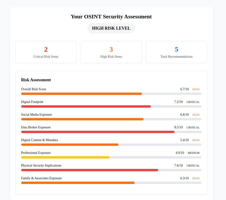 Discover your OSINT exposure level with our comprehensive OSINT Security Self-Assessment. This specialized evaluation analyzes your vulnerability across eight critical categories and provides personalized recommendations to reduce your intelligence gathering exposure.