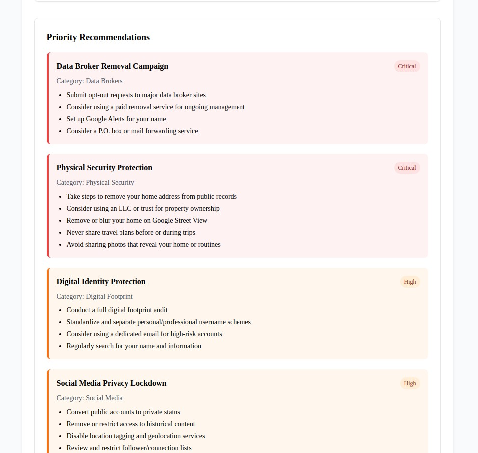 - Data Broker Presence - Your information's availability through commercial data aggregation services