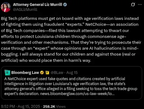 In a devastating blow to the age verification campaign, Louisiana officials discovered that NetChoice's expert witness used AI-generated fake quotes and citations in his testimony opposing the state's law. Attorney General Murrill stated: "That they're trying to prosecute their case through an 'expert' whose opinions are AI hallucinations is mind-boggling."