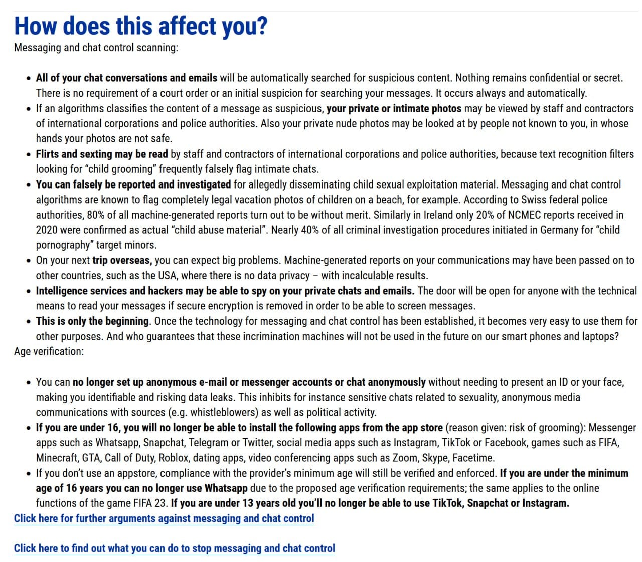 - Loss of Privacy: All private communications would be subject to automated scanning