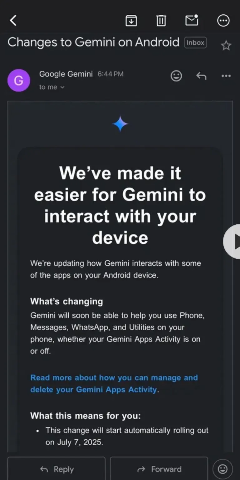 Google states that starting July 7, 2025, Gemini will "use Phone, Messages, WhatsApp, and Utilities on your phone, whether your Gemini Apps Activity is on or off." These extensions enable Gemini to interact with the Phone app, change system settings, and send text or WhatsApp messages to your friends.