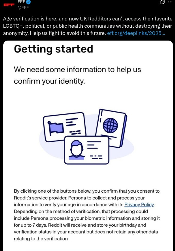 Age verification is here, and now UK Redditors can’t access their favorite LGBTQ+, political, or public health communities without destroying their anonymity. Help us fight to avoid this future. https://t.co/aXbQ6fJrzQ pic.twitter.com/OXNESFHMNs