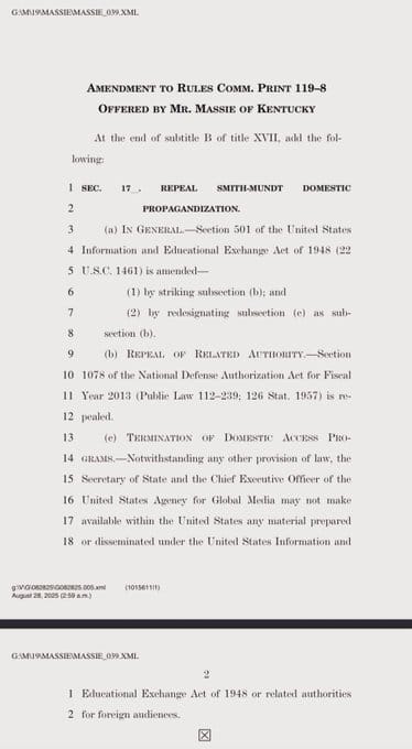 The quiet repeal of Smith-Mundt's domestic dissemination ban represents one of the most significant changes to American information policy in decades. Yet it occurred with minimal public awareness or debate. Thomas Massie's blocked amendment highlights how difficult it has become to reverse this expansion of government power.