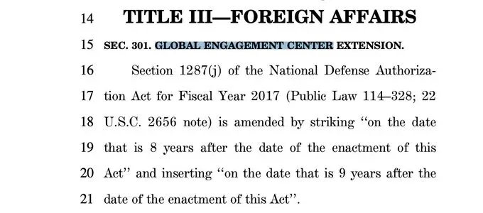 What started as a focused anti-terrorism initiative quickly expanded in scope. By the end of 2016, Congress had broadened the GEC's authority through the Countering Foreign Propaganda and Disinformation Act, which was included in the National Defense Authorization Act and passed with overwhelming bipartisan support—92-7 in the Senate.